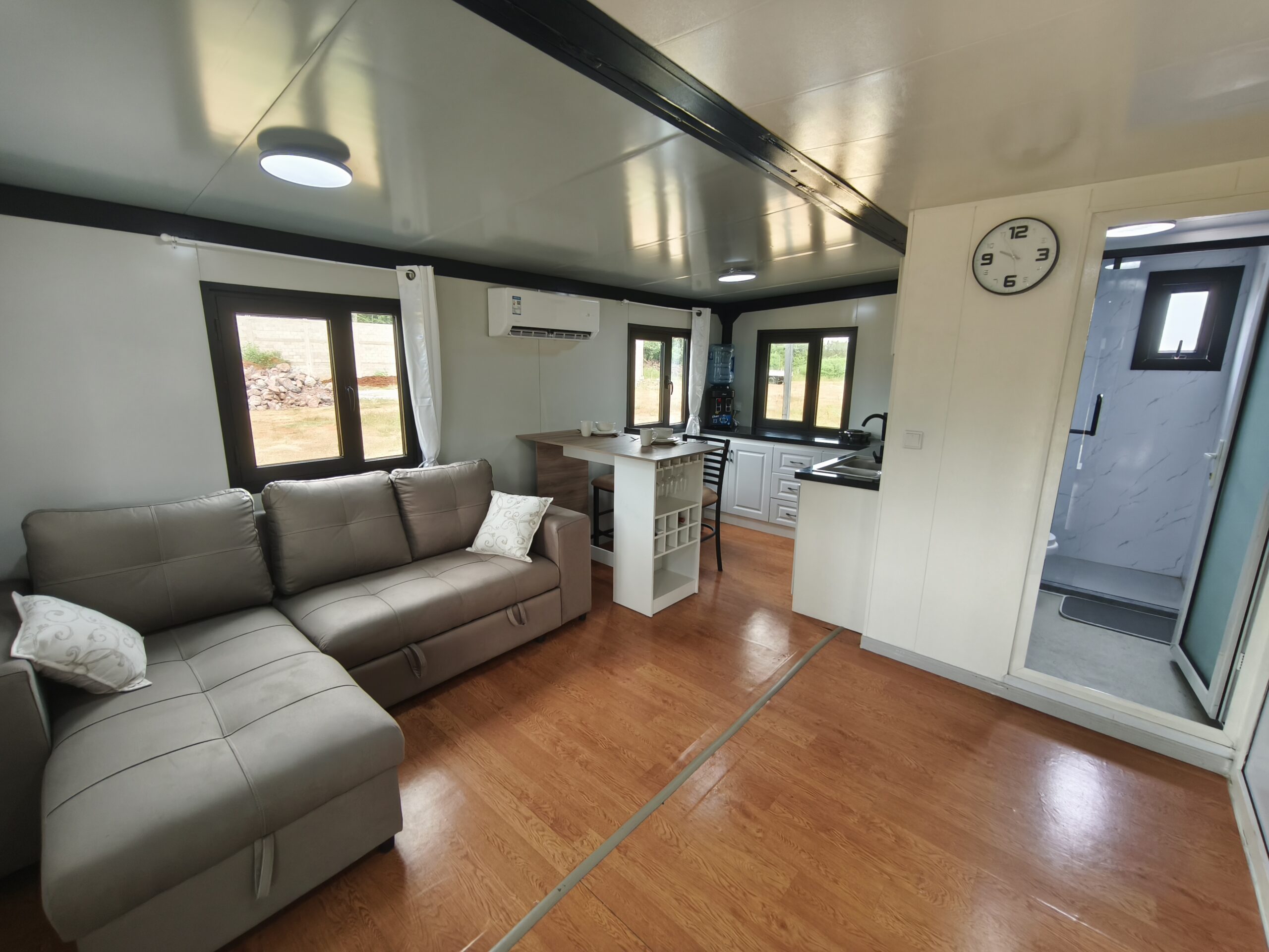 - No necesitas hacer obra: Al ser fabricadas y transportadas con todo ya incluido en su interior: distribución, baño, muebles de cocina, conexiones de luz y agua, etc. no necesitas hacer ninguna obra. Una vez se descarga la casa prefabricada en el terreno del cliente sobre la losa de hormigón o puntos de apoyo, se procede a realizar el montaje y, una vez finalizado, ¡ya estaría lista para entrar a vivir!