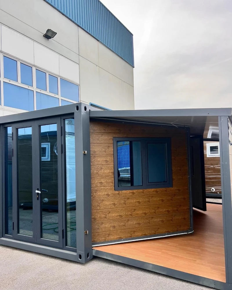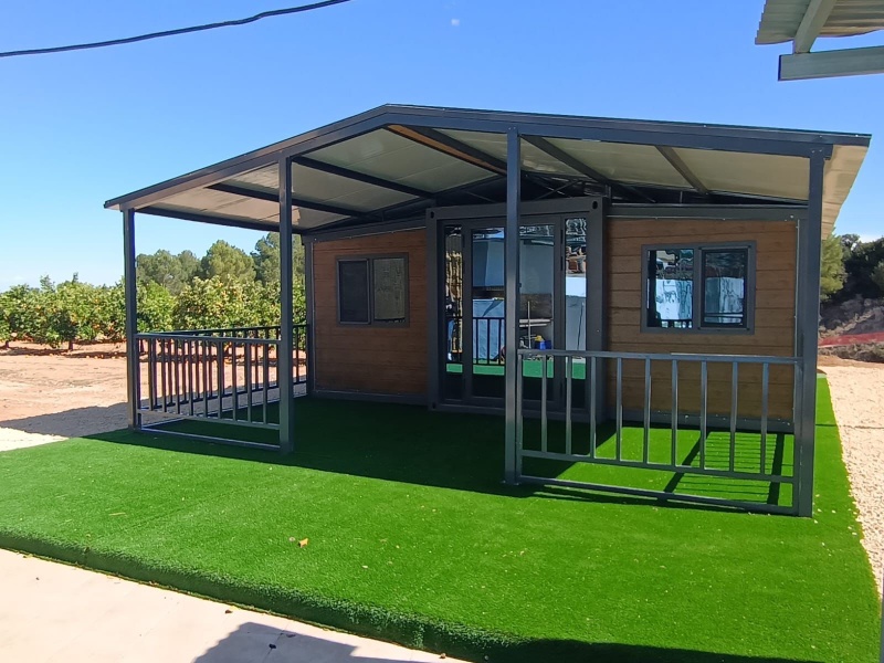 Estructura metálica inclinada (10°/40°), 54 m² incluyendo porche y zona habitable.