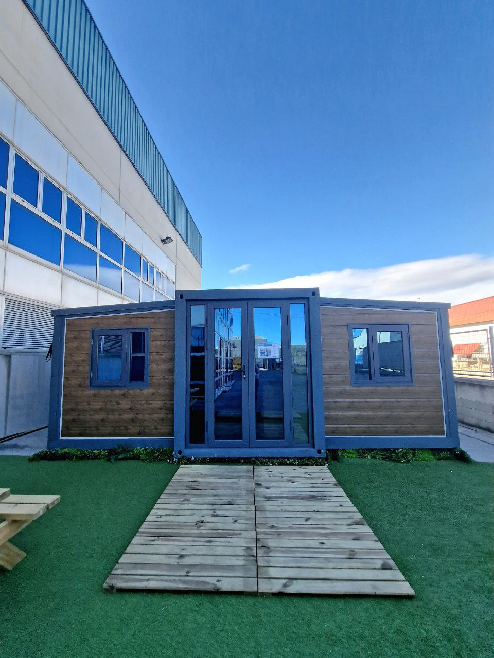 Estructura metálica inclinada (10°/40°), 54 m² incluyendo porche de 18 m² y zona habitable.