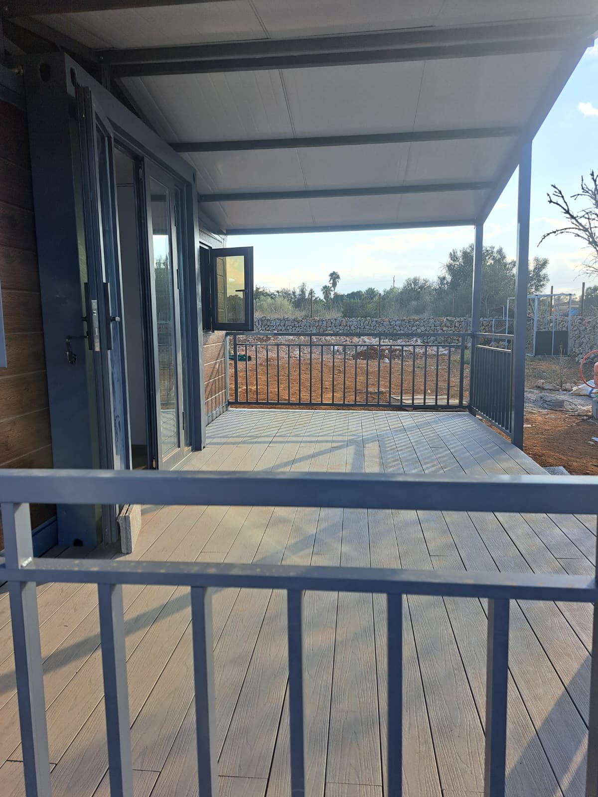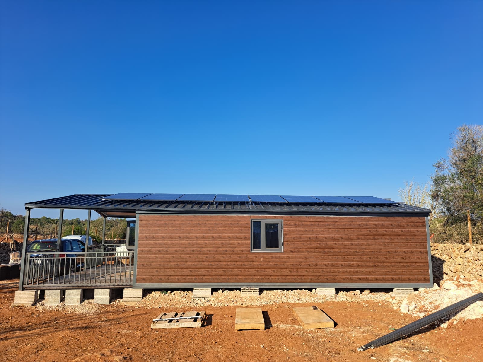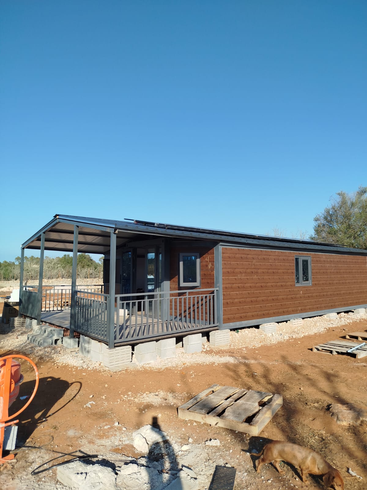 Estructura metálica inclinada (10°/40°), 72 m² incluyendo porche de 18 m² y zona habitable.