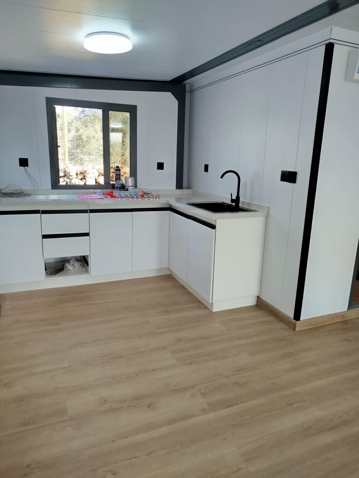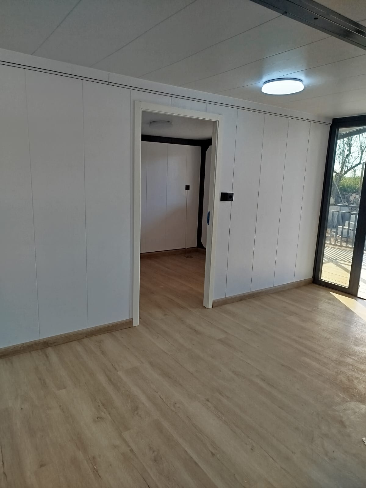 Su estructura está fabricada con paneles sándwich de 50 mm, lo que garantiza un excelente aislamiento térmico y acústico. Los acabados exteriores están revestidos con poliuretano de 18 mm y una chapa metálica con un efecto de madera blanca, lo que le otorga una estética cálida y natural, además de ser un material duradero y resistente a las inclemencias del tiempo.